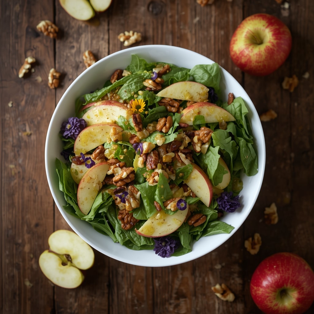 Step 1: Prepare Ingredients: Wash and dry the salad greens. Thinly slice the apples (leave skin on for color and texture). Toast walnuts in a dry skillet over medium heat for 3–5 minutes until fragrant.