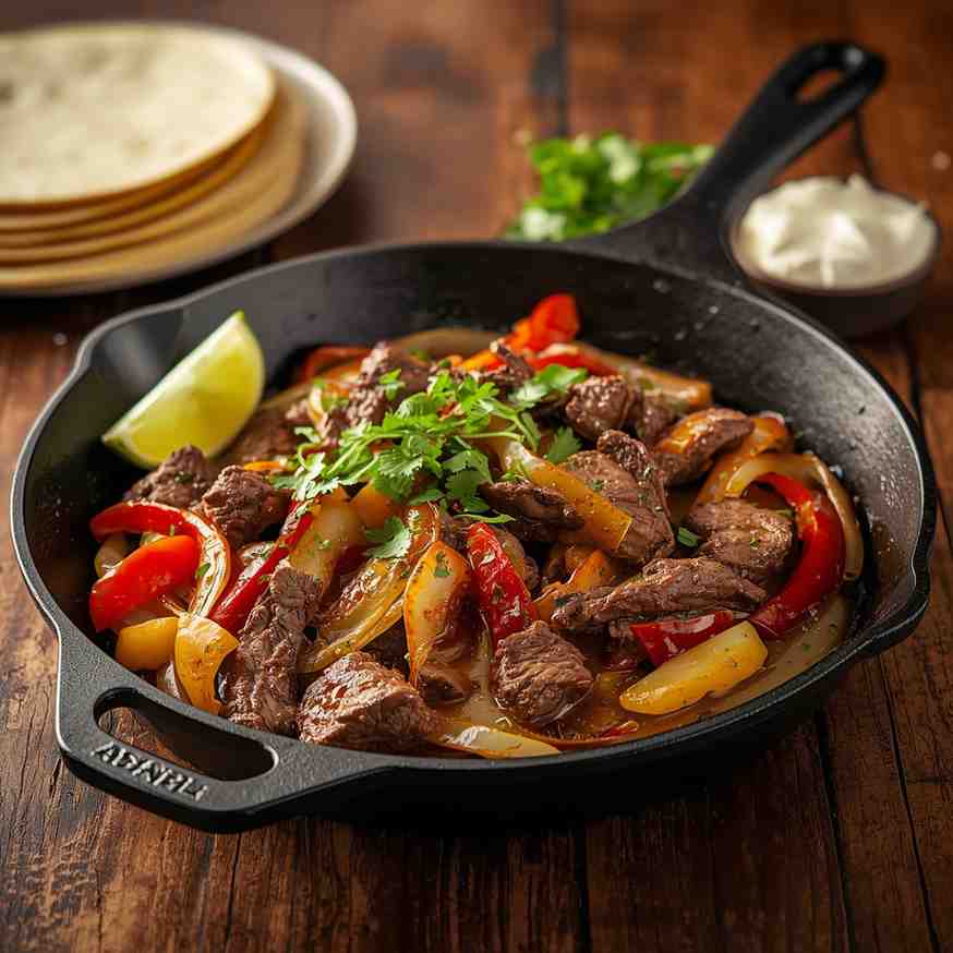 Beef Fajitas with Onions and Peppers is a classic Tex-Mex dish known for its sizzling presentation, bold flavors, and vibrant colors. Tender strips of marinated beef are seared to perfection alongside caramelized onions and colorful bell peppers, all wrapped in warm flour tortillas. This dish captures the essence of Mexican-inspired cuisine — smoky, tangy, and savory all in one bite.