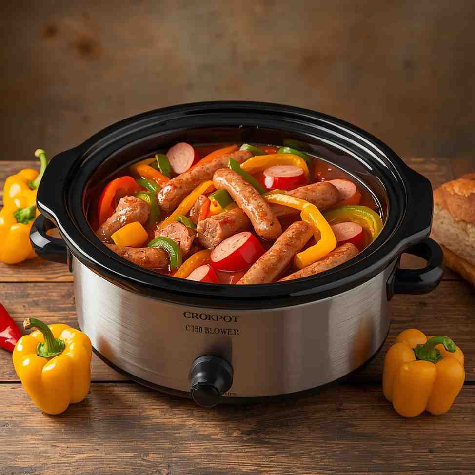 5. Slow Cook : Cook on LOW for 6–7 hours or HIGH for 3–4 hours. Sausages should be fully cooked and peppers soft.