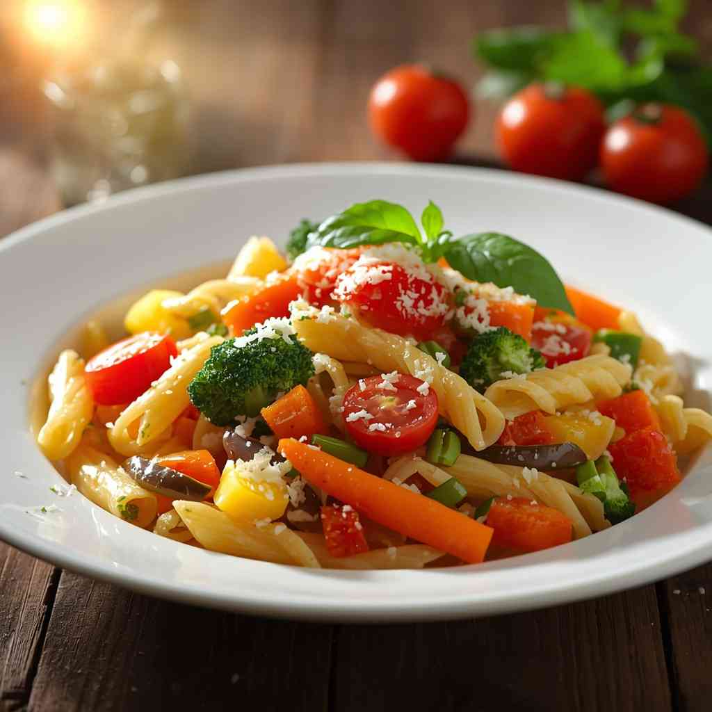It’s a joyful recipe that combines sautéed seasonal veggies such as bell peppers, zucchini, asparagus, and cherry tomatoes, tossed with al dente pasta and coated in a light Parmesan or cream-based sauce. Every bite offers a burst of freshness and texture — creamy, crunchy, and utterly delicious.